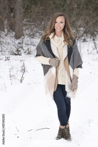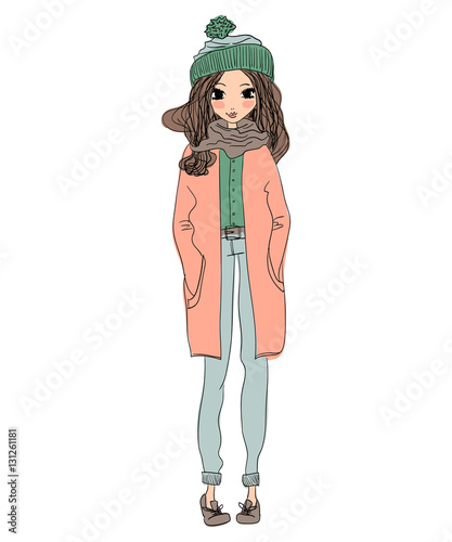 Fashionable Teenage Girl Wearing Cap And Muffler Coat In Studio