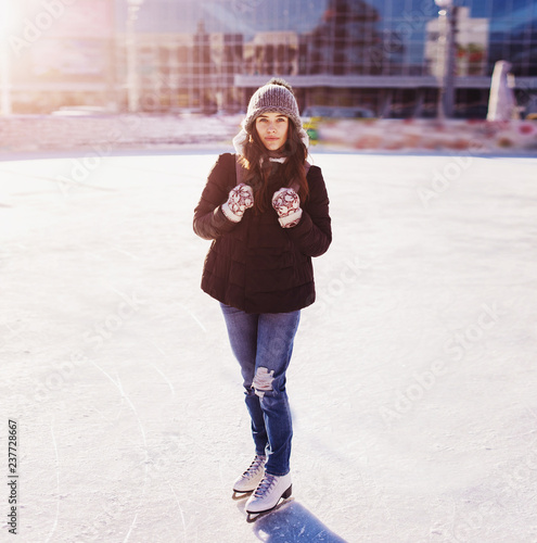 Happy Beautiful Girl Wearing Warm Winter Clothes Ice Skating
