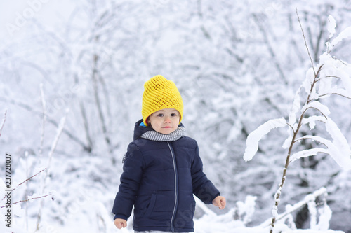 Cute Boy Walking In Winter Forest Handsome Little Boy Funny