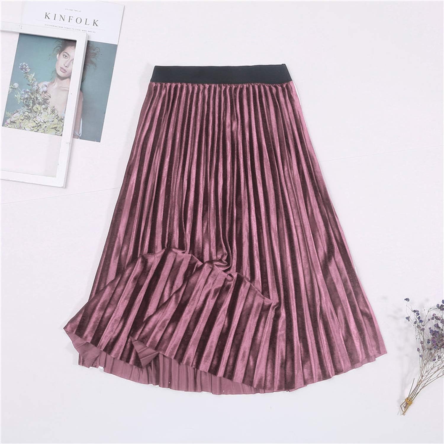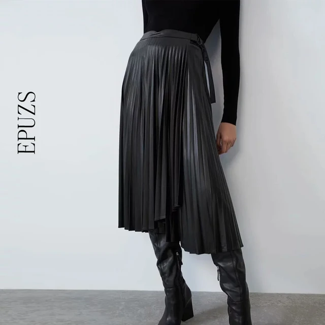Women Suede High Waist Midi Skirt Winter Vintage Style Pleated Ladies