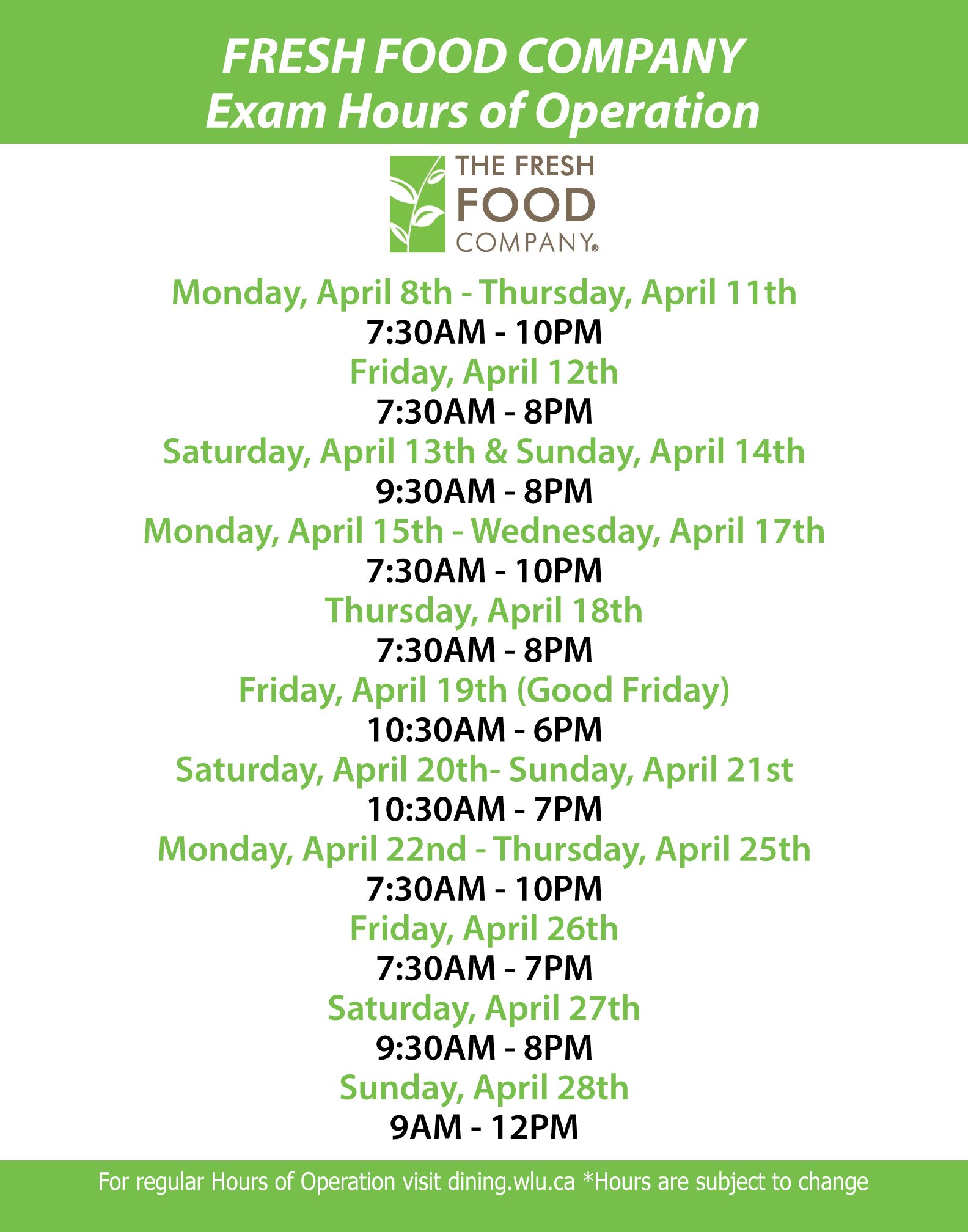 Laurier exam schedule winter 2019. The scheduling of final examinations. This schedule is for courses with scheduled final exams. 7 am 10 pm saturday. December 7th december 20th april 6th april 30th.