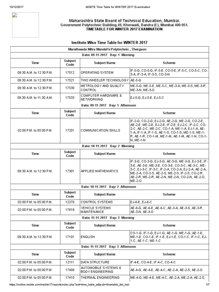 Msbte Final Time Table For Winter 2017 Examination Online Msbte Com