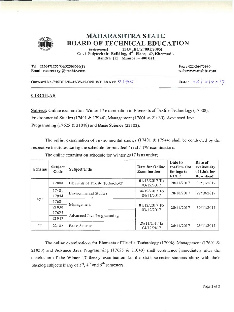 Msbte Result Msbte Time Table Winter 2017