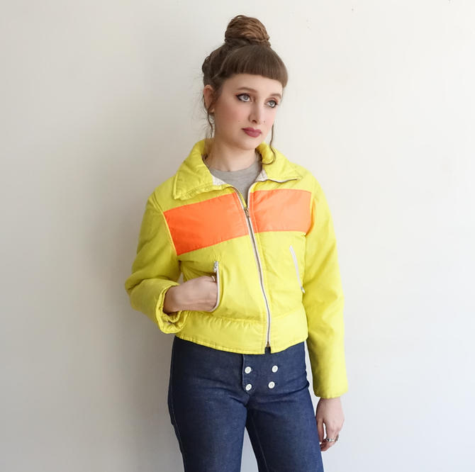 Vintage 70s Neon Ski Jacket 1970s Yellow Orange Cropped Winter