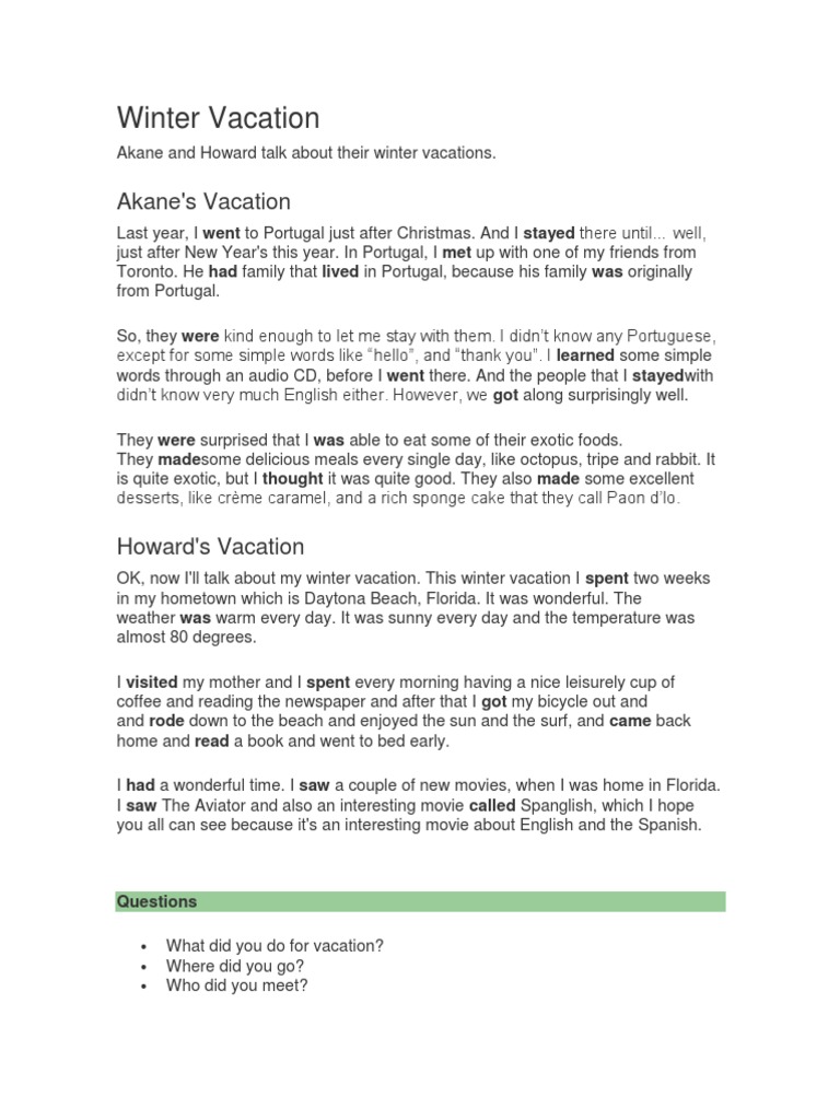 Watched tv watched movies. Best winter vacation in us comfort getting yourself a comfortable place to stay is very important. In this file there is a complete dialogue about what 2 people did on their winter vacationholidays as well as a dialogue box section. 2summarize the result in brief as follows.