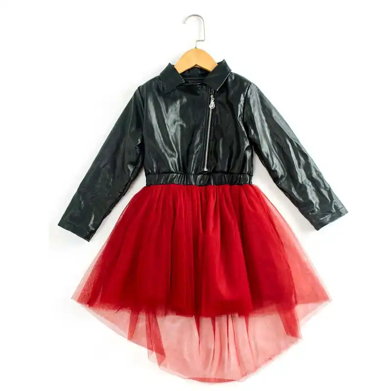 Girls Winter Dress Long Sleeve Leather Mesh Patchwork Dress