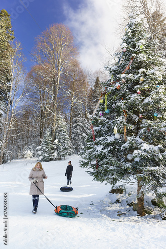 Children And Adults Ride On A Snowy Hill Sunny Winter Day In The