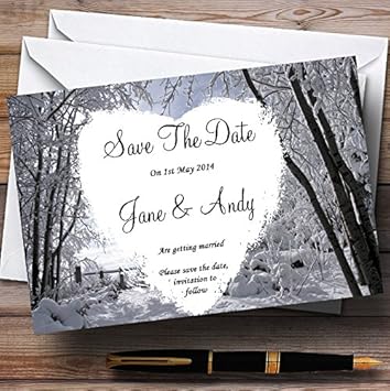 Winter Save The Date Cards With A Woodland Forest And Snowflakes